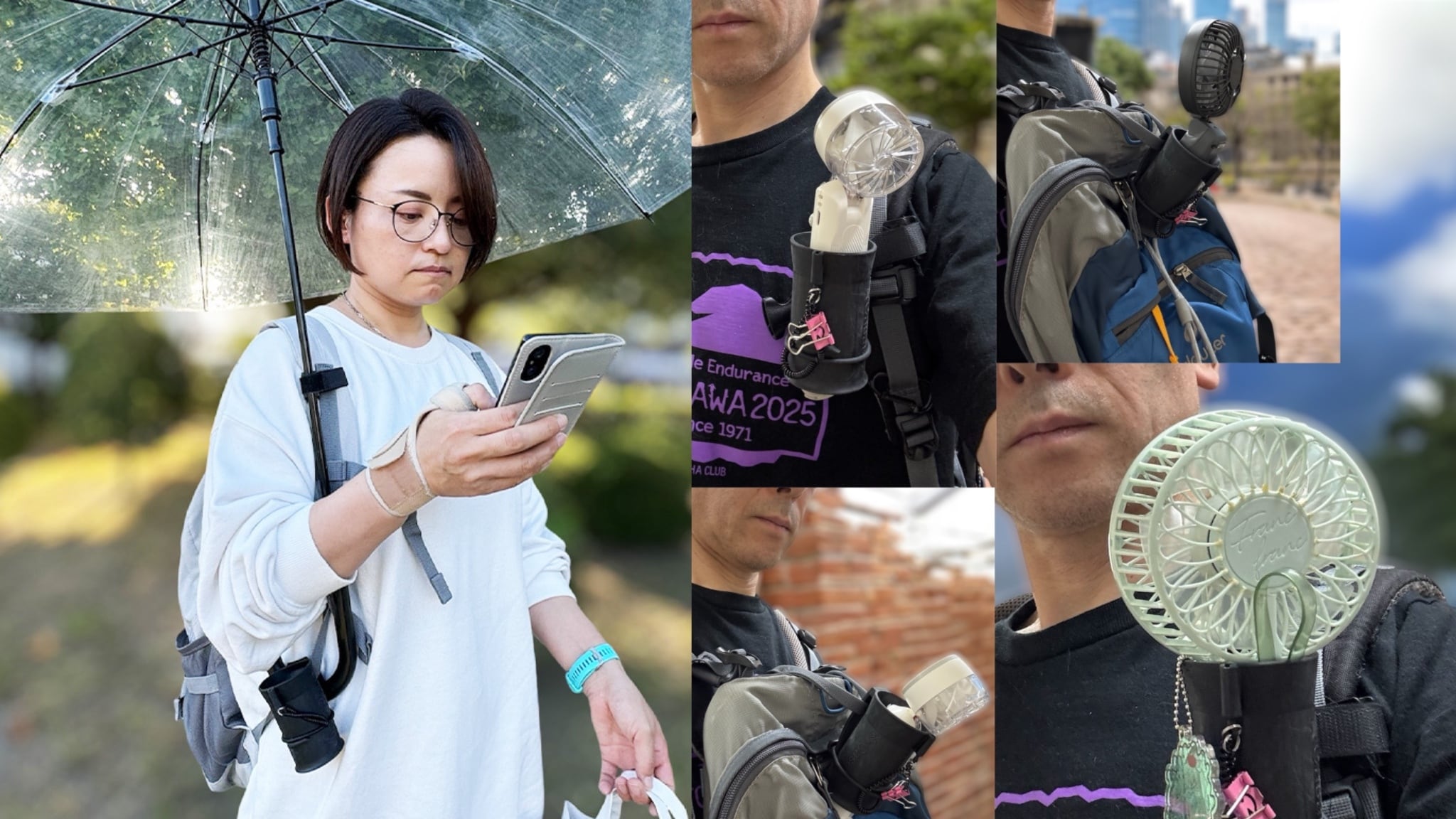 ラバーバンドは小さな持ち手の折りたたみ傘に使用します。小さい持ち手の日傘は柄の部分も細いのと、歩いている時の安定感は下がります。バインダークリップで最初から留めるのがいいです。バインダークリップは前後お辞儀するような動作が激しい時にアタッチメントのマジックベルトに取り付けます。