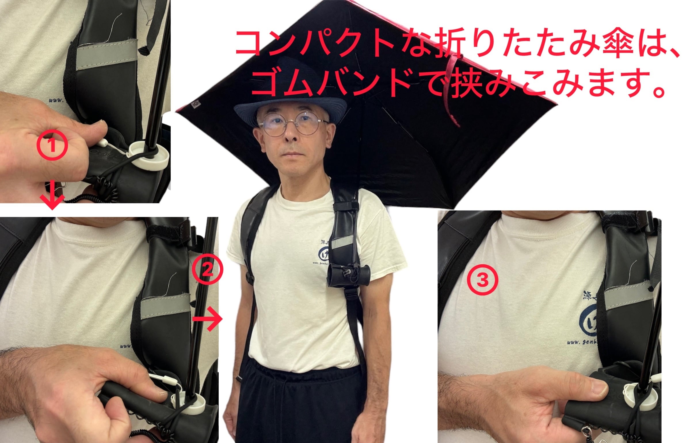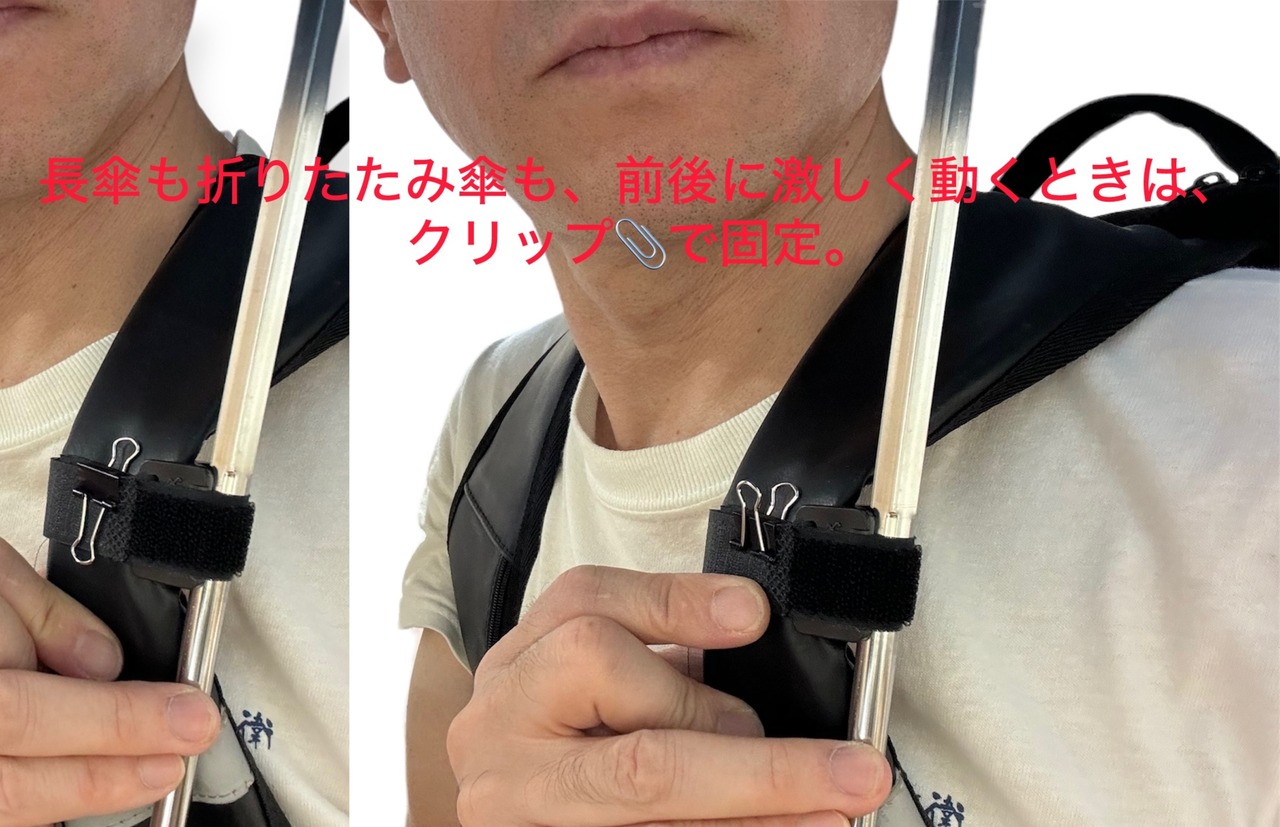 バインダークリップは前後の動きをするとき、特にお辞儀をするような動作の時にアタッチメントのマジックベルトに取り付けます。傘の重さでマジックテープが緩むので固定します。