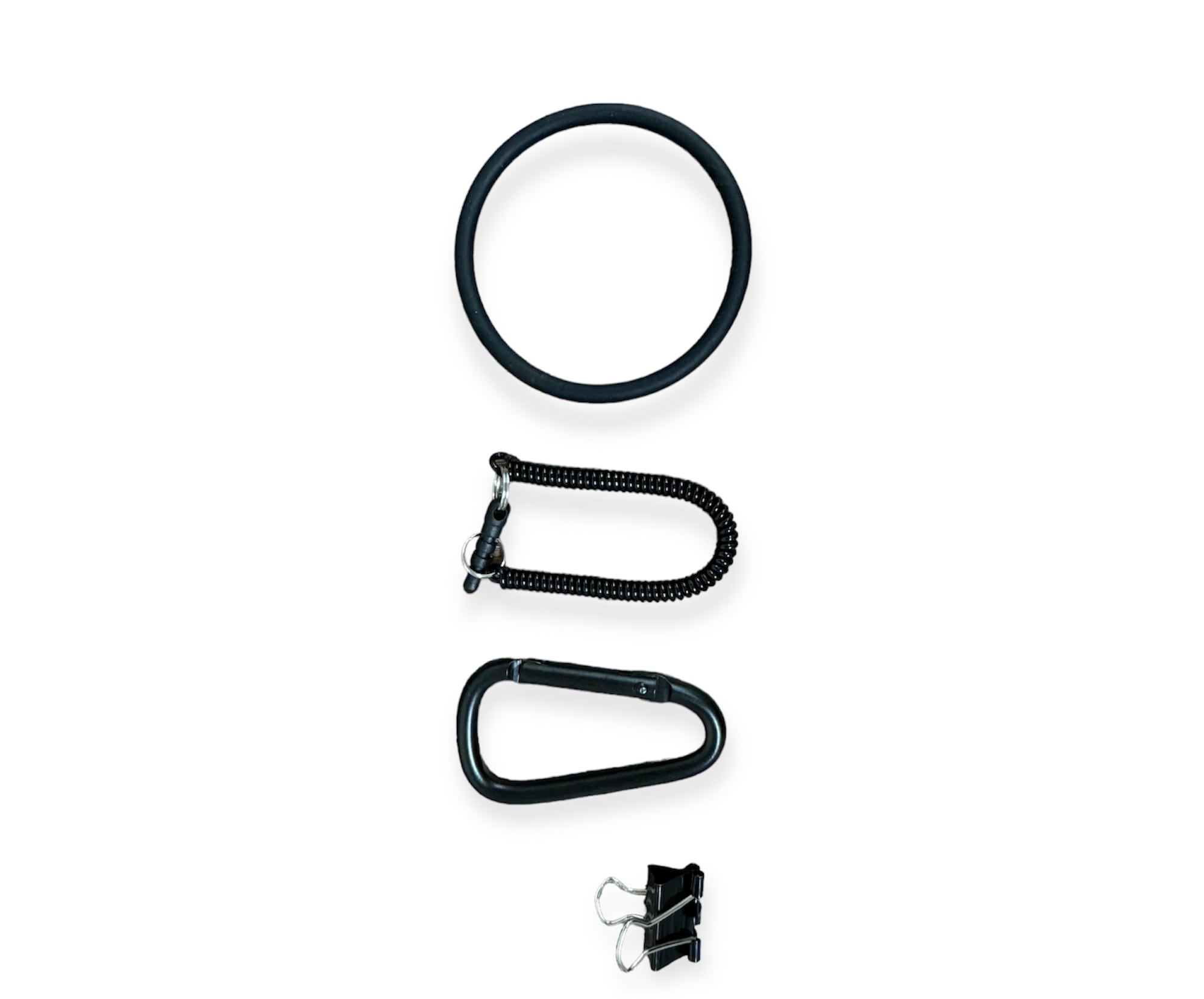 カラビナ、ワイヤージャック、ラバーバンド、バインダークリップの4点セット。
